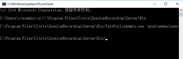 CA证书绑定完成后,打开CMD,cd到Session Recording Server的安装目录 C:\Program Files\Citrix\SessionRecording\Server\Bin ,接着输入命令:TestPolicyAdmin.exe -enablewebplayer 开启webplayer功能(如果需要关闭,用TestPolicyAdmin.exe -disablewebplayer)。