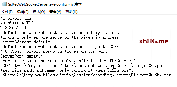 打开Session Recording Server的安装目录bin文件夹,编辑SsRecWebSocketServer.exe.config,修改 TLSEnable=1;在第11和13行填入SSL证书和Key的PEM格式文件路径,目前仅支持PEM格式证书。CA证书转PEM参考官方手册:https://docs.citrix.com/zh-cn/session-recording/current-release/view-recordings/session-recording-web-player.html
