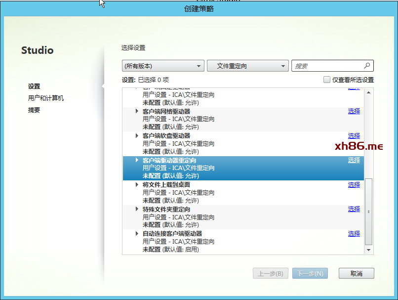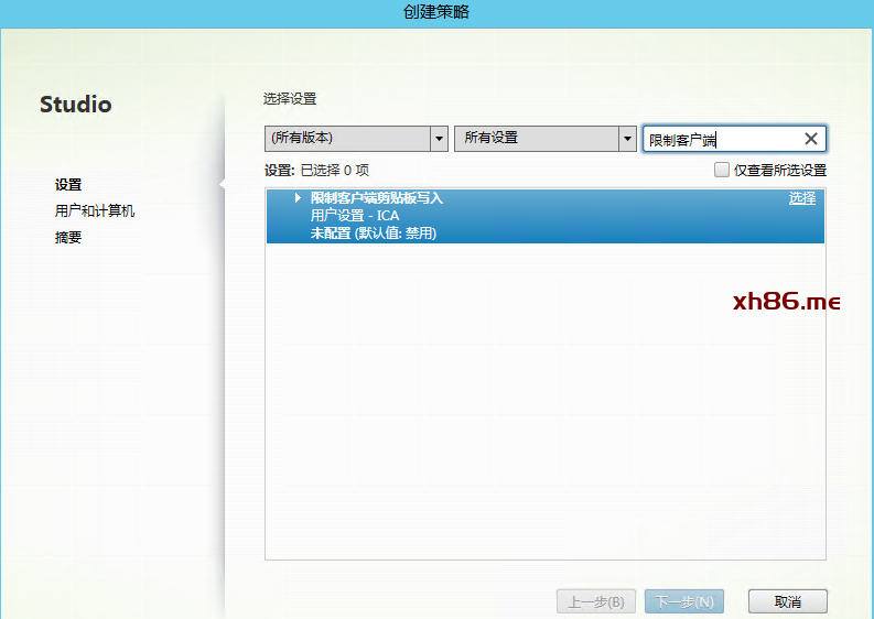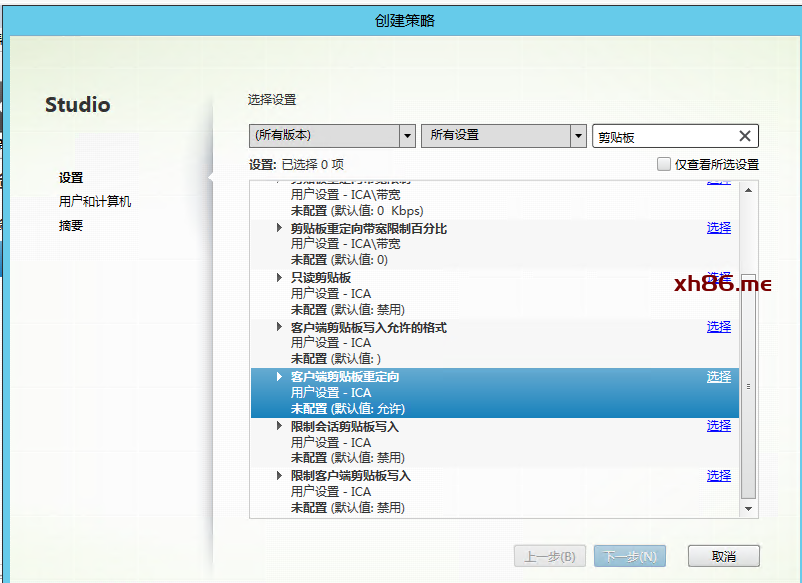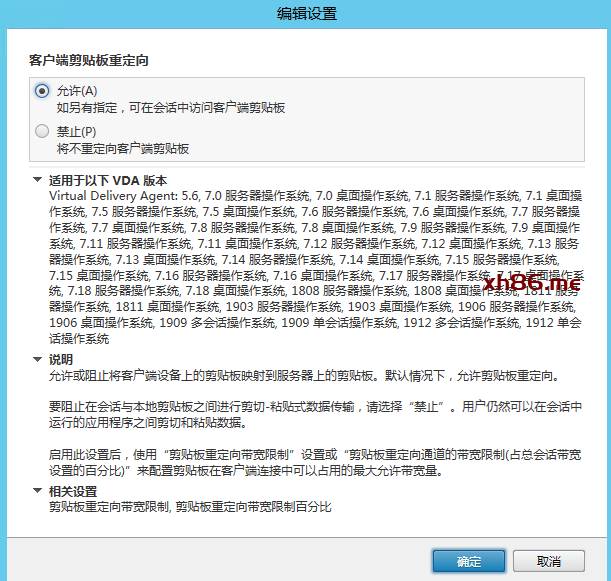 默认情况下,该策略是允许客户端使用剪贴板的。用户连接到VDA时,可在本地客户端和虚拟桌面之间互相剪贴文本内容。 首先,打开“Citrix Studio”,在左边控制台树,点击“策略”。在右边点击“创建策略”,创建一条新的策略。找到“客户端剪贴板重定向”,点击“选择”链接,编辑设置。 ![]() 点击“选择”链接,编辑设置。 ![]() 系统默认允许剪贴板重定向,检查确认即可。 |