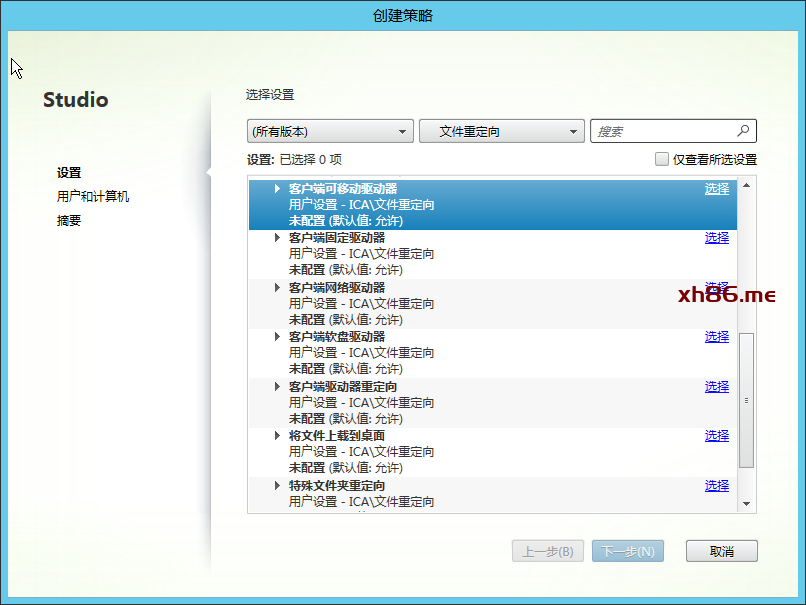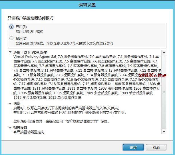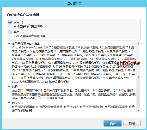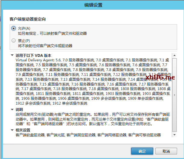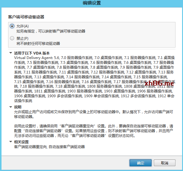 默认情况下,该策略是允许客户端访问可移动驱动器的。用户连接到VDA时,会提示是否允许访问客户端本地的驱动器,是只读还是可写。 首先,打开“Citrix Studio”,在左边控制台树,点击“策略”。在右边点击“创建策略”,创建一条新的策略。 ![]() 要启用USB磁盘重定向,需要首先启用“客户端驱动器重定向”策略。该策略是USB磁盘,也就是移动驱动器的依存策略。只有允许该策略,才能够允许移动驱动器重定向策略。 ![]() 点击“选择”链接,确认允许客户端驱动器重定向。 ![]() 接下来需要配置客户端移动驱动器重定向。 ![]() 点击“选择”链接,编辑设置。 ![]() 系统默认允许客户端移动驱动器重定向,检查确认即可。 为了让终端用户每次登录时自动连接客户端移动驱动器,可以配置“自动连接客户端驱动器”策略。 ![]() 默认为允许,检查配置。和客户端驱动器重定向策略一样,该策略除了移动驱动器之外,也对客户端软盘驱动器、客户端光驱、客户端硬盘、客户端移动磁盘、客户端网络盘生效。 ![]() |