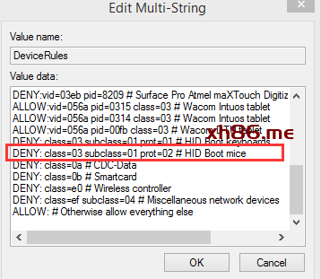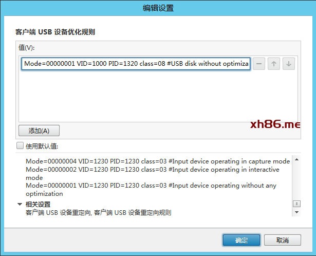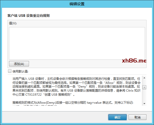 默认的允许禁止策略为: DENY: class=09 # Hub devices DENY: class=03 subclass=01 # HID Boot device (keyboards and mice) DENY: class=0b # Smartcard DENY: class=e0 # Wireless Controllers DENY: class=02 # Communications and CDC Control DENY: class=0a # CDC Data ALLOW: # Ultimate fallback: allow everything else 策略逐条进行比对匹配,要禁用所有USB设备,可使用未附带任何其他标记的”DENY:”。 1、可使用策略配置规则: ![]() 点击“添加”,填入类似以下内容: Allow: VID=XXXX PID=XXXX # XXXX是ID,这里写注释 2、也可直接修改注册表 HKEY_LOCAL_MACHINE\SOFTWARE\Policies\Citrix\<userID>\User\VCPolicies 修改注册表可能导致系统异常,同时也不如组策略灵活 ![]() |