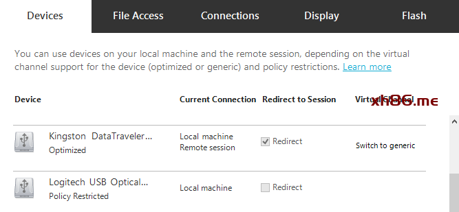 对于USB磁盘映射,有两种方式,默认使用HDX优化模式,USB磁盘上的数据会以优化模式实现更好的传输性能。当然,也可以切换到通用USB设备映射模式。这个模式通常为了解决大于4GB的文件传输和USB磁盘使用加密信息的问题,例如某些加密USB磁盘在使用时会检查USB设备上的加密信息,而该信息必须通过USB总线通信完成。