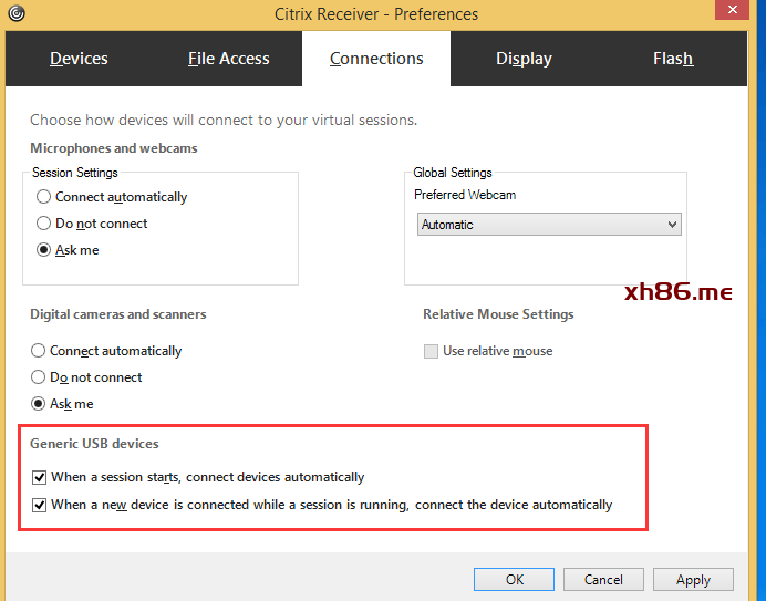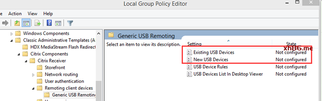 用户可以自行勾选自动映射选项 ![]() Receiver端的配置可以使用icaclient_usb.adm(.ADMX/.ADML)组策略模板。如果客户端支持组策略,可以使用模板配置自动映射策略 ![]() 如果设备使用虚拟通道,可以修改注册表: HKEY_LOCAL_MACHINE\SOFTWARE\Wow6432Node\Citrix\ICA Client\GenericUSB\Devices 或 HKEY_LOCAL_MACHINE\SOFTWARE\Citrix\ICA Client\GenericUSB\Devices 直接制定特定类型的设备进行重定向 ![]() |