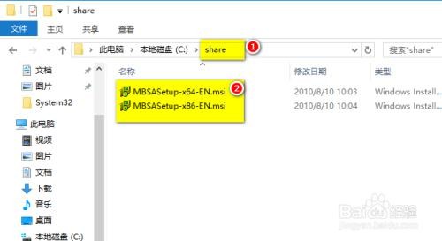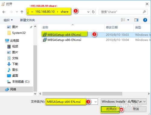 打开前面设置的共享,网络路径\\192.168.80.10\share 单击 MBSASetup-x64-EN.msi