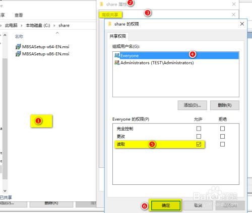 在域控制器中,给 share 文件夹设置共享,让所有人都有读取的权限如图所示