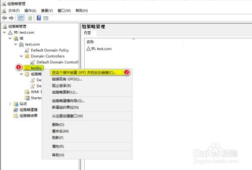 然后,鼠标右击组织单位 testbu,在点击“在这个域中创建 GPO 并在些链接…”,给这个GPO输入一个名称为“软件分发”