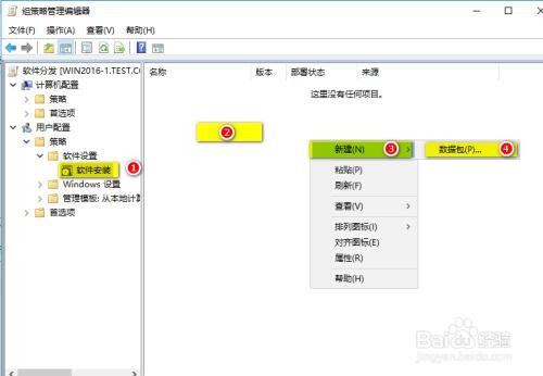 弹出“组策略编辑器”,点击“用户配置”里的“策略”,打开“软件设置”,再单击“软件安装”, 然后在右边空白处鼠标右击,选择“新建”里的“数据包…”