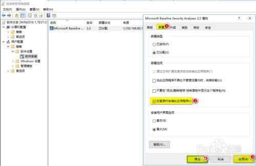 弹出 MBSA 软件分发的属性,单击“部署”选项卡,勾选“在登录时安装此应用程序 ”; 如图所示:
