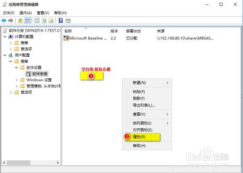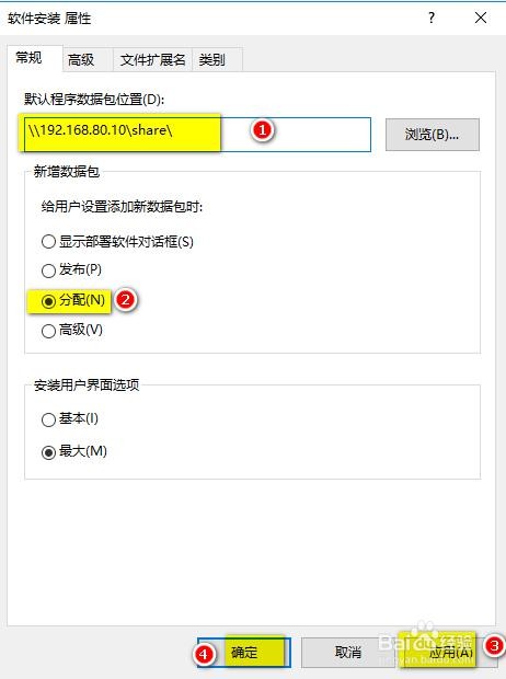 弹出“ 软件安装 属性” 输入软件数据包的位置( 软件网络共享所在的文件夹)