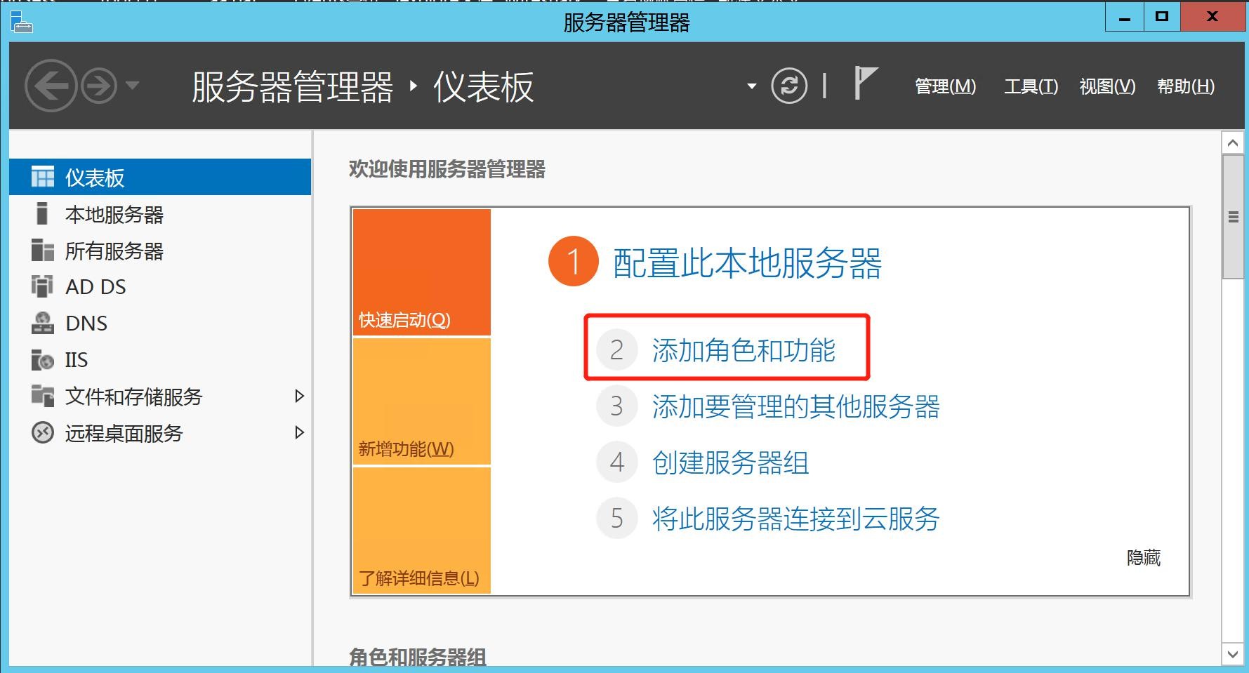 2、在打开的服务器管理界面点击”添加角色和功能”如下图所 示