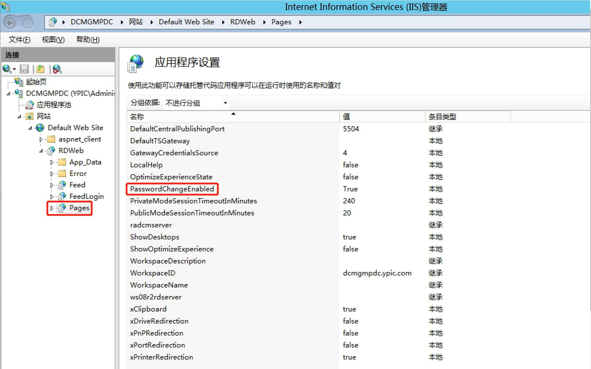2、配置IIS 启用密码修改功能,将 “PasswordChangeEnabled”的值改为”True”,我这里已经改好了,如下图所示: