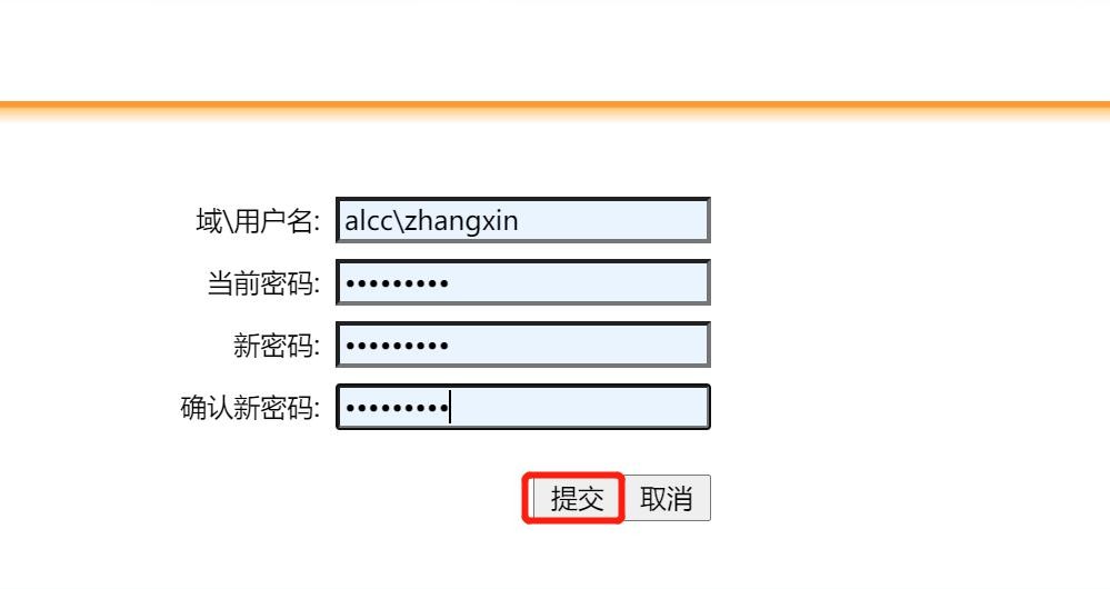 (二) 在上面打开的界面中,我们输入域名\用户名、旧密码、2 次新密码,点击修改测试,输入用户名、密码后,单击” 提交”按钮,如下图所示: