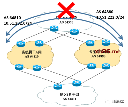 换句话说,一级骨干A网的公网路由是10.51.202.0/24,不能让B网的设备学习到;一级骨干B网的公网路由是10.52.222.0/24,不能让A网的设备学习到。