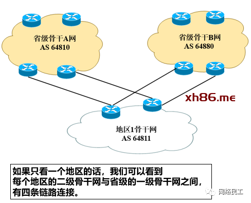 第二个问题:每个地区的二级骨干网与两张一级骨干网,中间有四条链路互联,如何保证选路顺序呢?