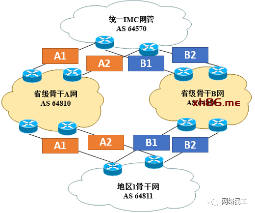 一级骨干B网,有两个ASBR。一级骨干B网的ASBR-1与二级骨干ASBR-1之间的链路为B1链路,ASBR-2与二级骨干ASBR-2之间的链路为B2链路。