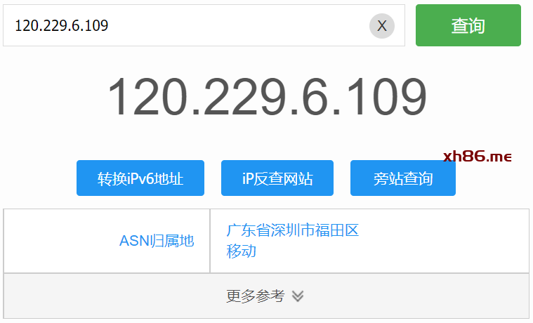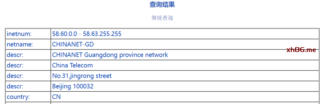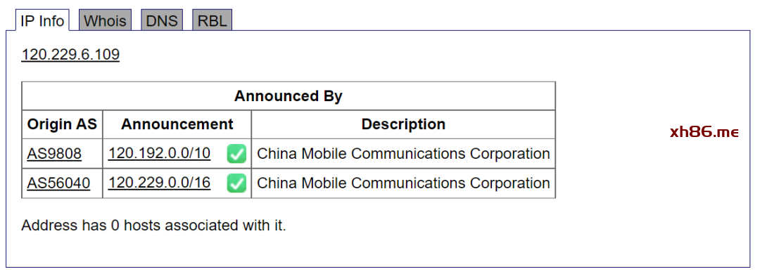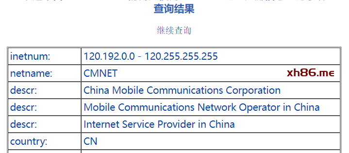 查询结果是中国移动,位置范围是国家或地区级,而不是省份或直辖市级。因为查询发现 120.229.6.109 属于 120.190.0.0 – 120.255.255.255 范围中,也就是 120.192.0.0/10 网段,显示的就是这个网段的信息。