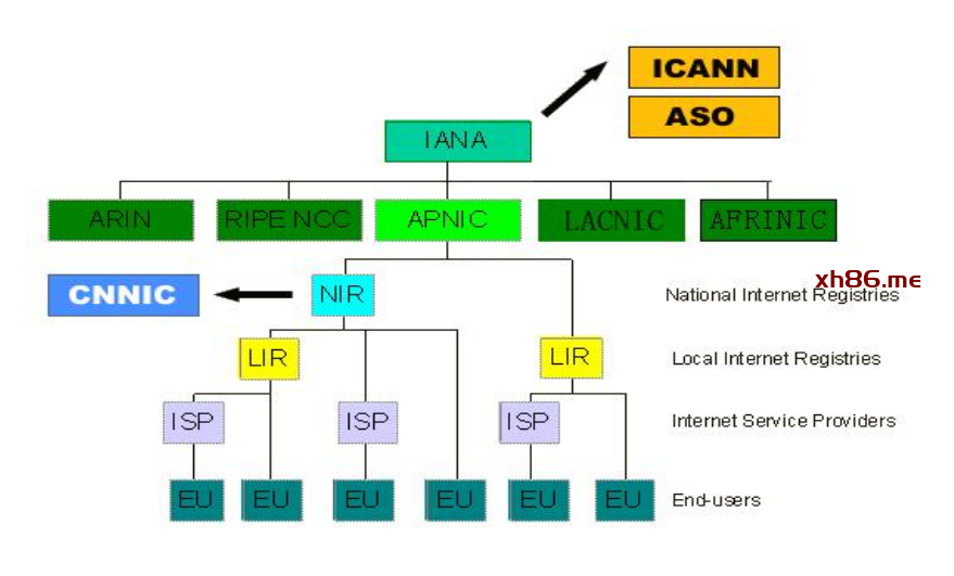 这五个 RIR 分别管理不同区域,它们也不直接给用户分配 IP 地址,而是分配给 NIR ,NIR 再分配给 LIR ,LIR 最后分配给 ISP 或最终用户。CNNIC 是中国唯一的 NIR ,也是 APNIC 下面的 NIR 。中国的 ISP / IDC / ICP / 企事业单位都是通过 CNNIC 申请 IP 地址。