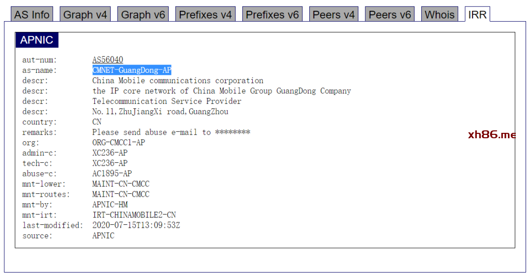 查看到 120.229.6.109 有两个 ASN ,一个是 AS9808 ,包含 120.192.0.0/10 网段,属地为中国。另一个是 AS56040 ,包含 120.229.0.0/16 ,属地为中国广东。更精准的定位,需要按照最长匹配原则,选择最长匹配的网段,也就是选择 120.229.0.0/16 的位置信息,即中国广东。