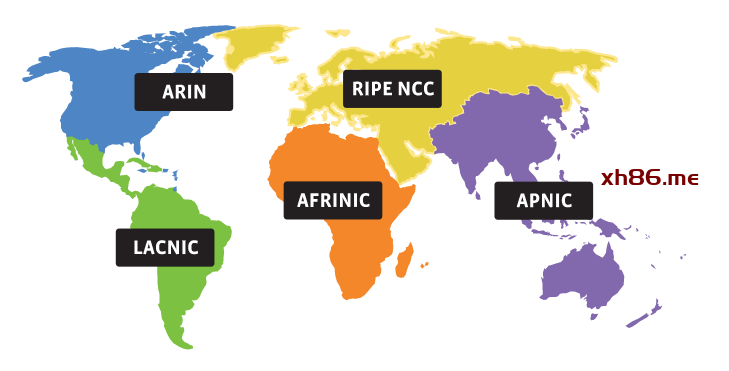 众所周知,接入互联网,需要有公网 IP 地址。公网 IP 地址由 ISP 提供。然而 ISP 只是二道贩子,全球 IP 地址一级一级分配下来的。IANA 管理所有的 IP 地址,它大手一挥,把所有可用的 8 位网段的地址分配给了五个 RIR 。这五个 RIR 分别是 ARIN 、RIPE NCC 、APNIC 、LACNIC 、AfriNIC 。