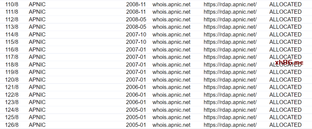 从 IANA 地址分配表来看,我们可以通过 IP 地址的前八位,判断出 IP 地址属于哪个 RIR ,也就知道 IP 地址的位置范围。但是这个范围实在太大了,相当于全球范围的五分之一。想要更精确的位置,可以往下看 RIR 地址分配表,就能确定 IP 地址属于哪个国家或地区。以 APNIC 举例,通过下面链接查看 APNIC 地址分配详情: