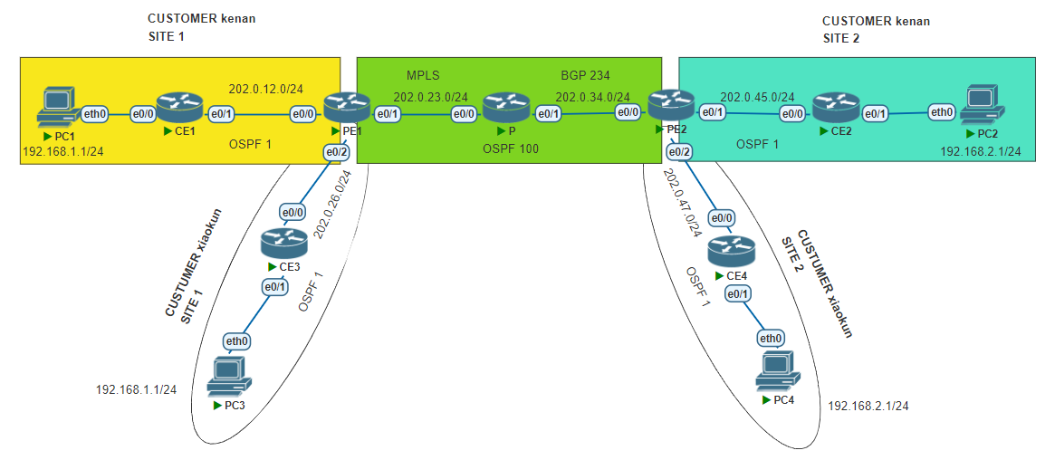 ip vrf kenan #定义名为kenan的VRF rd 234:2 #设置RD值(AS号加编号) route-target export 234:2 #设置出方向的RT值(和对端PE的import对应) route-target import 234:4 #设置入方向的RT值(和对端PE的export对应) ! ip vrf xiaokun rd 234:5 route-target export 234:6 route-target import 234:7 ! ! ! ! mpls label range 200 299 #设置mpls标签范围(仅为方便实验观察,现网中请慎用) mpls ldp router-id Loopback0 # ! ! interface Loopback0 ip address 2.2.2.2 255.255.255.255 ! interface Ethernet0/0 ip vrf forwarding kenan #将接口划分给vrf(划分之后接口IP地址会被移除) ip address 202.0.12.2 255.255.255.0 ! interface Ethernet0/1 ip address 202.0.23.2 255.255.255.0 mpls ip #启用mpls ! interface Ethernet0/2 ip vrf forwarding xiaokun ip address 202.0.26.2 255.255.255.0 ! interface Ethernet0/3 no ip address shutdown ! router ospf 1 vrf kenan #配置PE和CE之间的动态路由(需在完成vrf配置之后,不然无法启动进程) redistribute bgp 234 subnets #将bgp重发布进此路由进程 network 202.0.12.2 0.0.0.0 area 0 ! router ospf 2 vrf xiaokun redistribute bgp 234 subnets network 202.0.26.2 0.0.0.0 area 0 ! router ospf 100 router-id 2.2.2.2 network 2.2.2.2 0.0.0.0 area 0 network 202.0.23.2 0.0.0.0 area 0 ! router bgp 234 bgp router-id 2.2.2.2 no bgp default ipv4-unicast #关闭bgp的ipv4单播 neighbor 4.4.4.4 remote-as 234 neighbor 4.4.4.4 update-source Loopback0 ! address-family vpnv4 #进入vpnv4地址族 neighbor 4.4.4.4 activate #激活邻居 neighbor 4.4.4.4 send-community extended exit-address-family ! address-family ipv4 vrf kenan redistribute ospf 1 match internal external 1 external 2 #将vrf的OSPF路由重发布进BGP(将所有OSPF的路由都重发布进来) exit-address-family ! address-family ipv4 vrf xiaokun redistribute ospf 2 match internal external 1 external 2 exit-address-family !