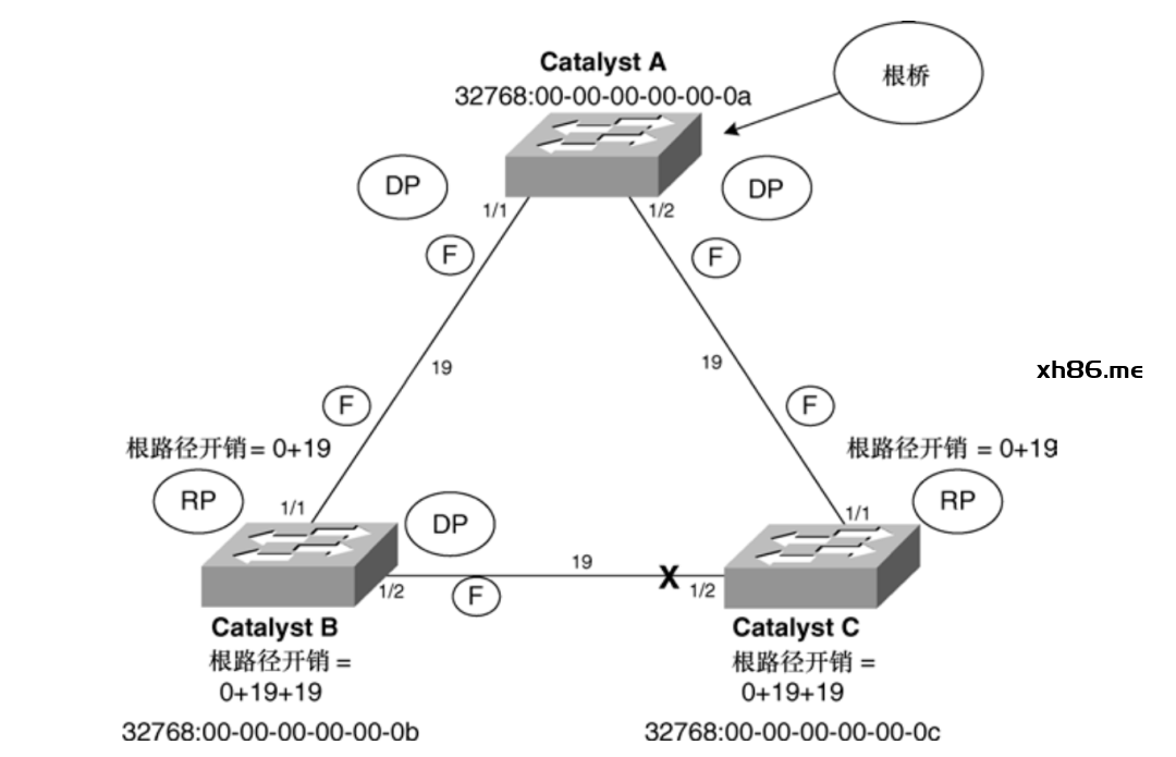 来看一个STP运作的例子,如下图所示为3台Catalyst交换机互连成的三角形拓扑网络。RP代表根端口,DP代表指定端口,F代表处于转发状态的端口,X代表处于阻塞状态的端口。