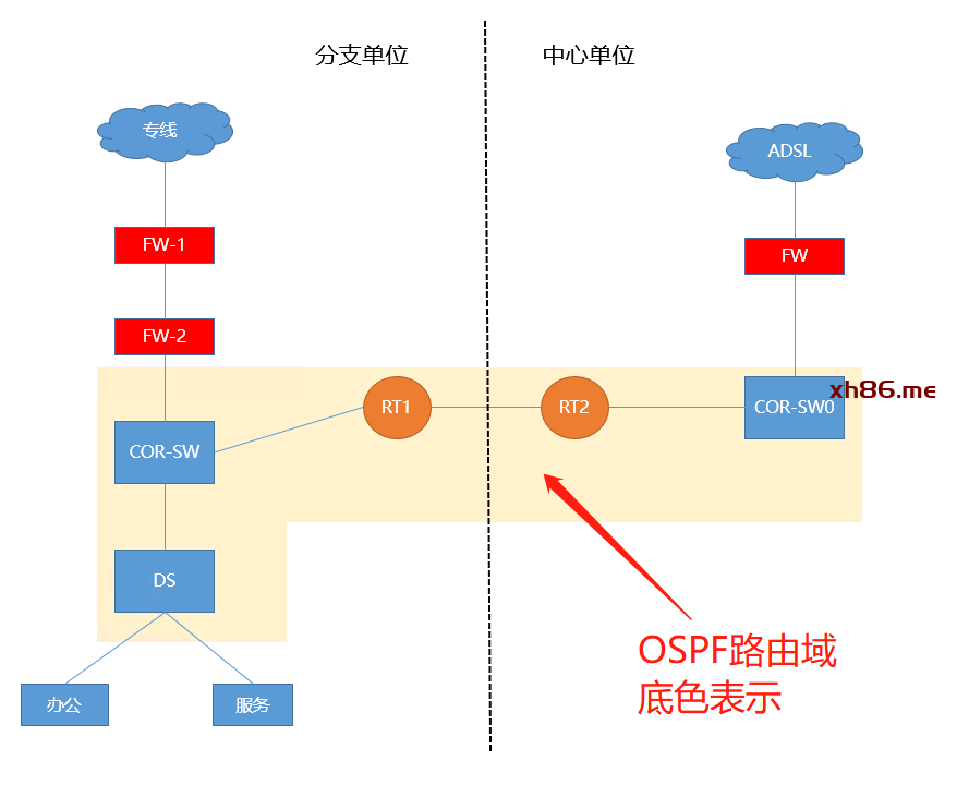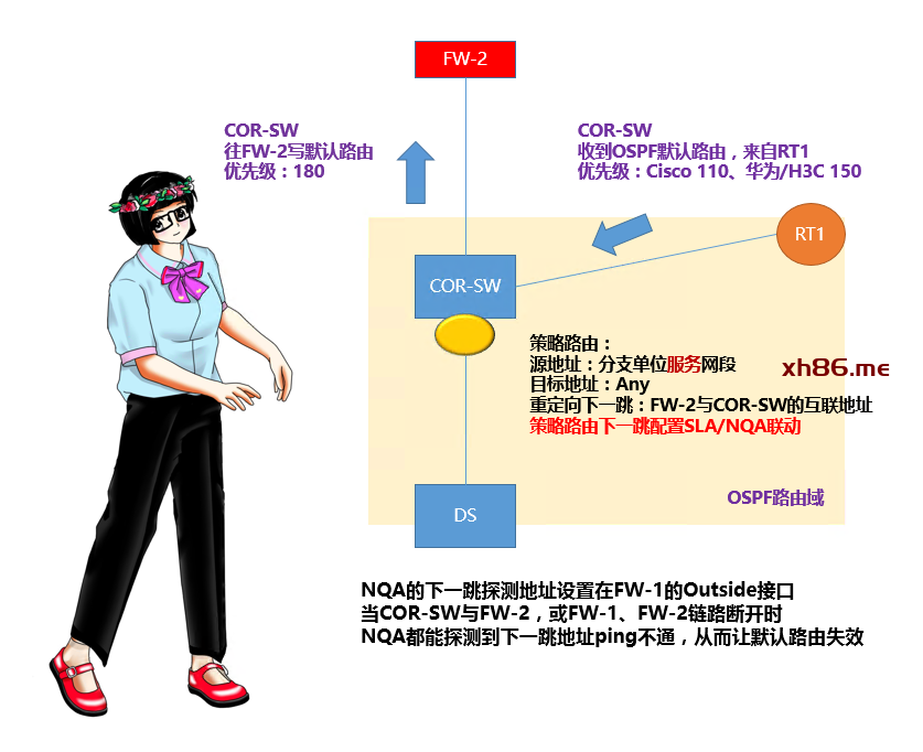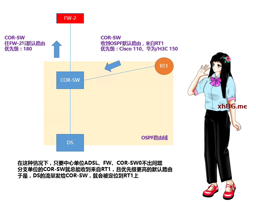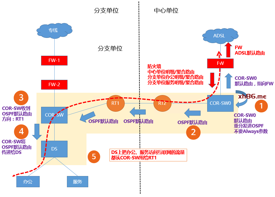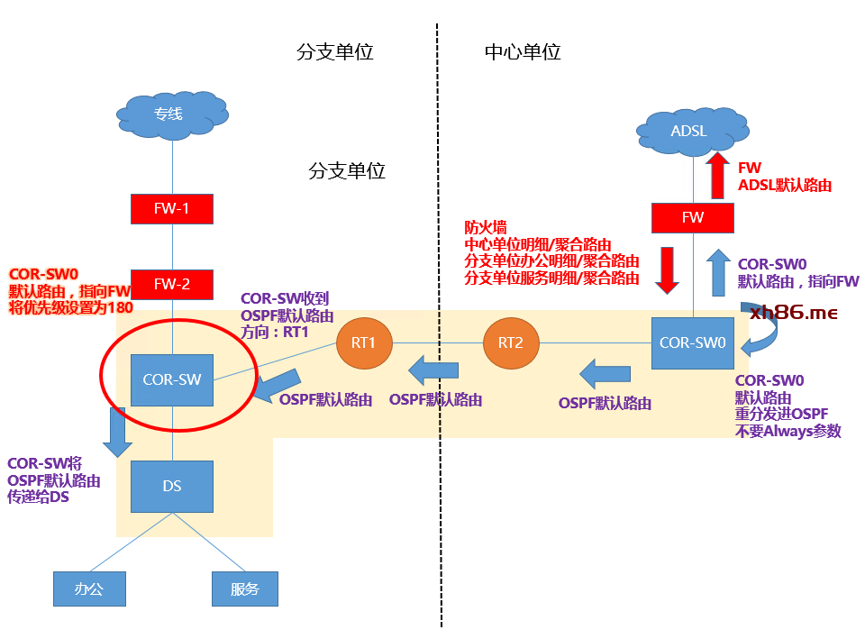 1、分支单位办公网段优先走COR-SW、RT1到中心单位,由RT2、COR-SW0、FW、ADSL访问互联网。当RT2、COR-SW0、FW、ADSL之间任意一条连读断开,COR-SW没收到优先级更高的OSPF默认路由,于是它上面写的优先级数值为180的默认路由浮出路由表,使分支单位办公网也可以走FW-2、FW-1、专线访问互联网。