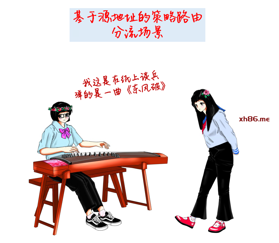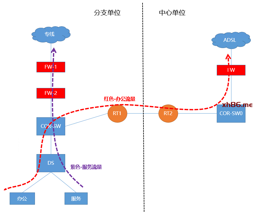 看起来不算困难,但有一个要求,就是分支单位的办公网段上网,需要通过路由器RT,走中心单位的ADSL上网,而分支单位的服务网段上网,就直接走分支单位的专线。这个流量用下图来表示: