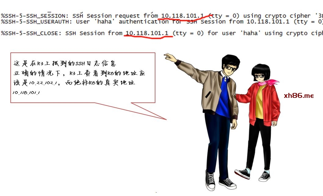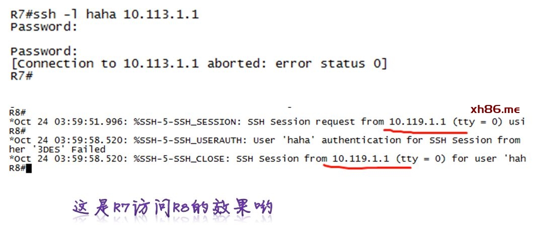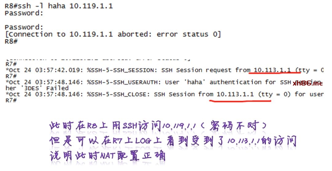 在R7、R8、R3上配置SSH功能及SSH Logging event,这样就可以查看源地址有没有被转换了。