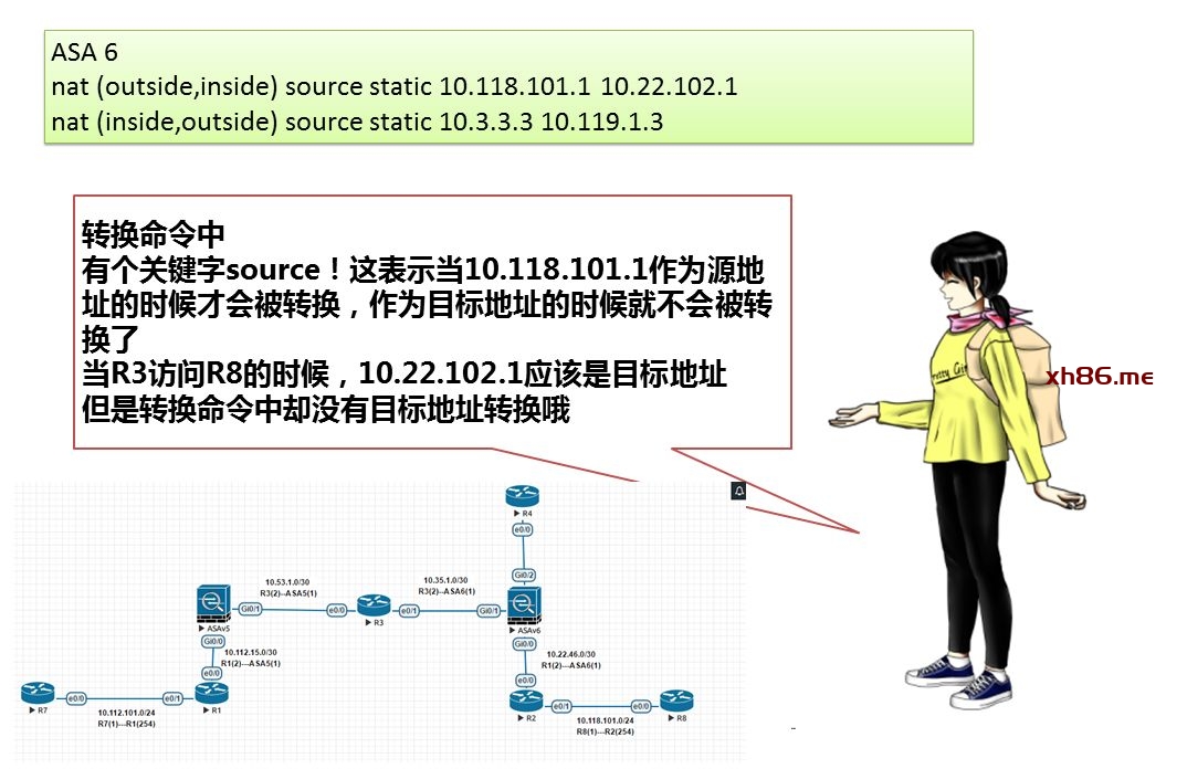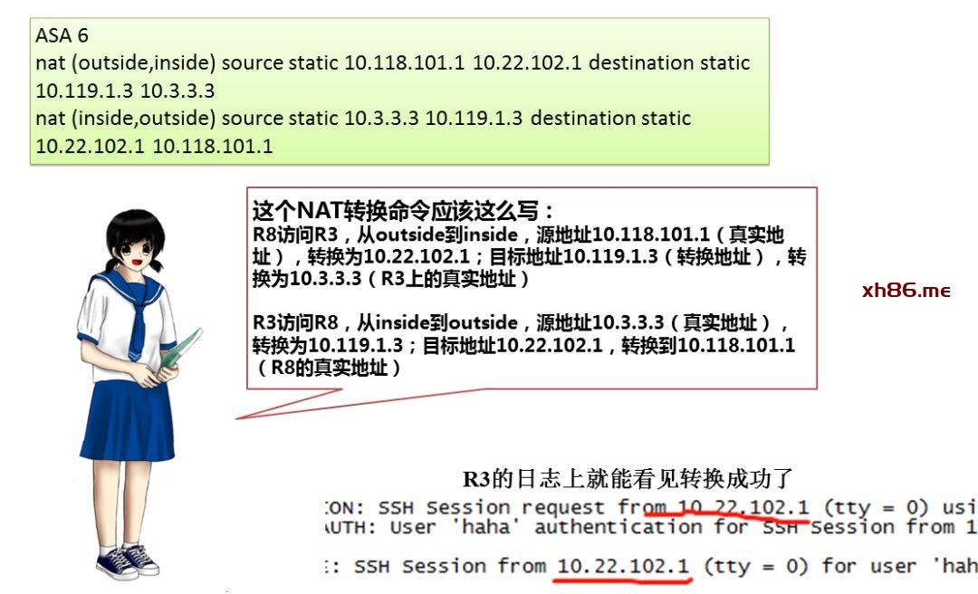 从inside方向进来的源地址10.22.102.1(该地址由R8的10.118.101.1转换而来),转换到Outside方向的接口上成为10.113.1.1