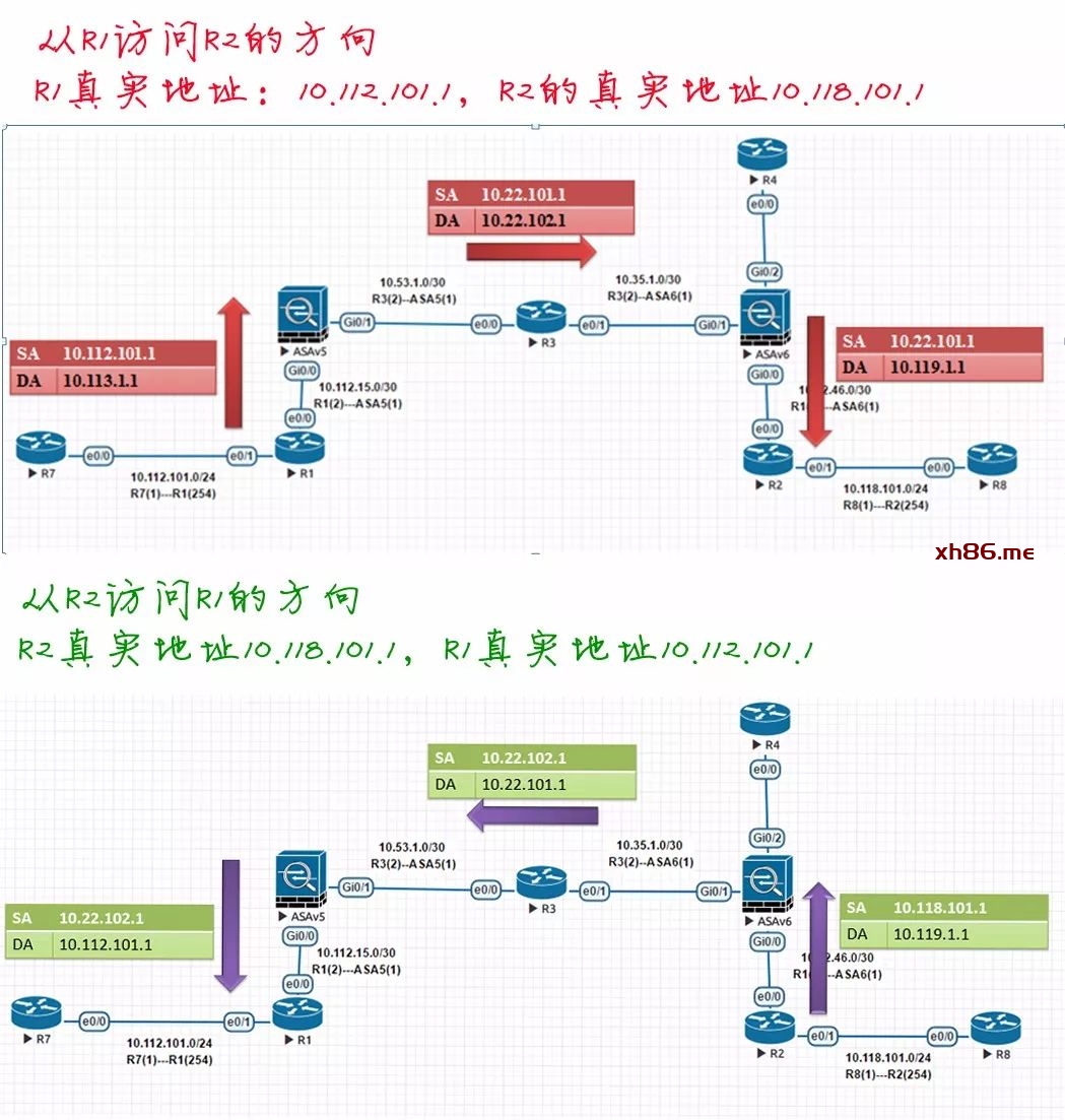 R1的Loopback 0地址,经过ASA5以后,被转换为10.22.101.1,再经过ASA6被转换为10.119.1.1