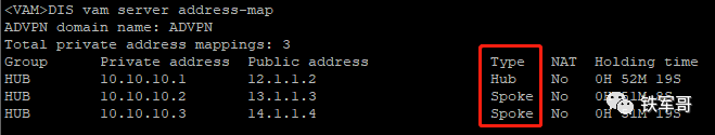 查看注册到主VAM Server的所有VAM Client的IPv4私网地址映射信息,可以看到HUB和SPOKE设备对应的隧道接口地址、公网地址、角色等信息。
