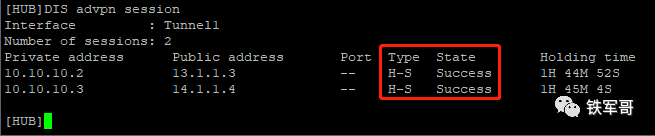查看HUB上的IPv4 ADVPN隧道信息,可以看到类型是H-S,说明本端是HUB角色,对端是SPOKE角色。