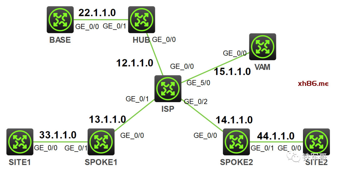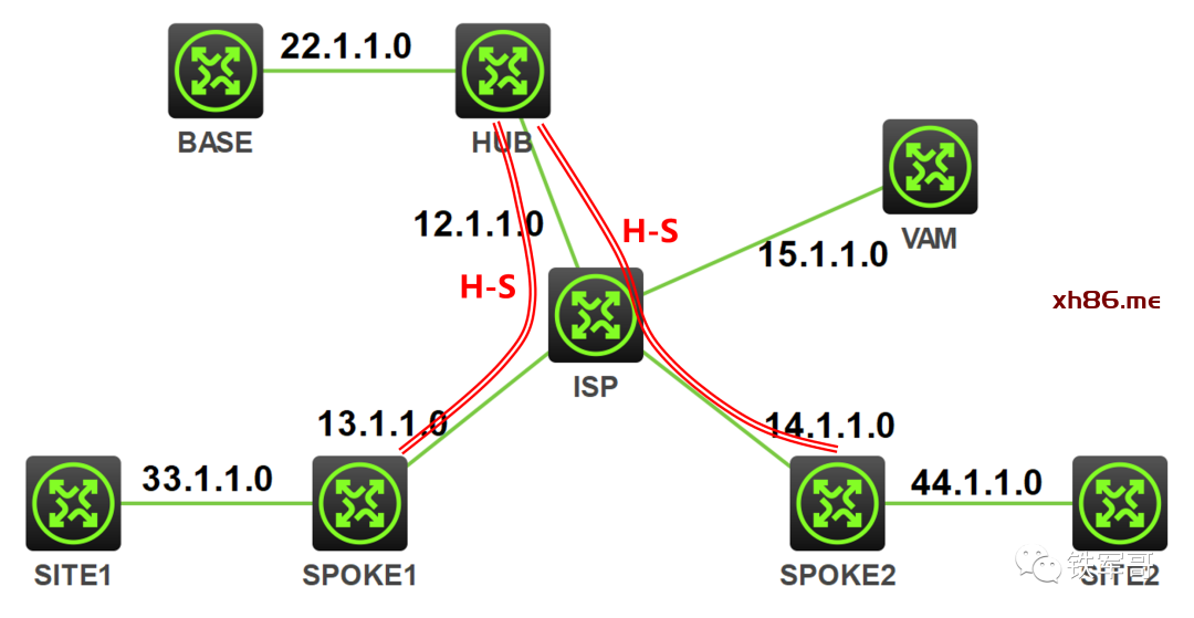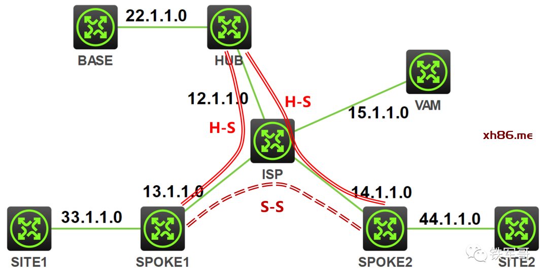 在Hub-Spoke模型中,只有Hub设备和Spoke设备之间建立的H-S隧道或S-H隧道。