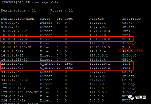查看SPOKE2设备的路由,已经通过OSPF学习到了HUB和SPOKE1的私网路由,而且可以看到现在SPOKE2和SPOKE1的互联地址是直连路由了,而在Hub-Spoke模型中还是OSPF路由。