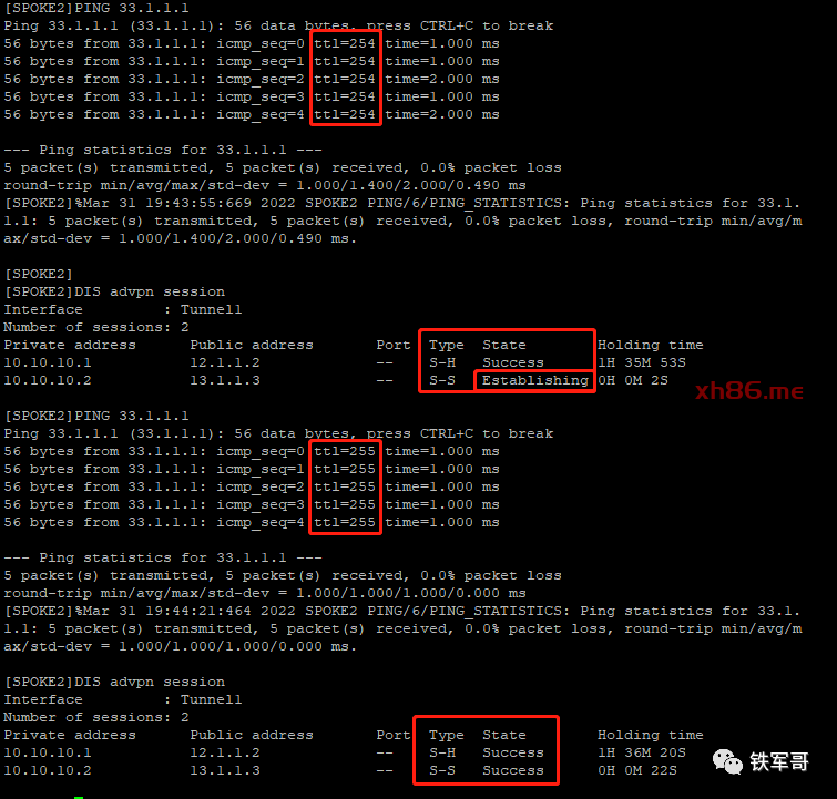 可以看到,第一次触发的时候,TTL还是254,此时ADVPN的隧道状态是建立中。等隧道建立成功之后,TTL就变成了255,说明SPOKE2和SPOKE1之间成功建立了直连隧道S-S。