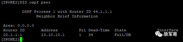 查看OSPF邻居状态,SPOKE2还是只和HUB建立邻居关系。