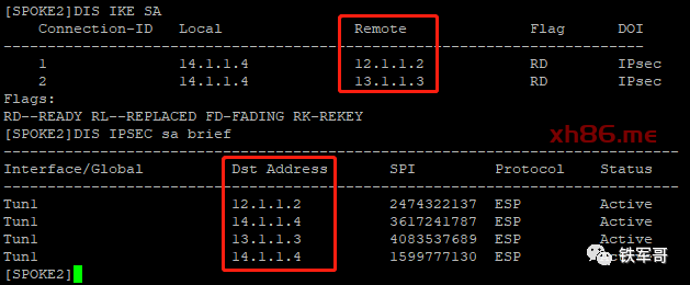 查看SPOKE2建立的IKE SA和IPsec SA信息,可以看到,隧道存在于SPOKE2和HUB、SPOKE2和SPOKE1之间。