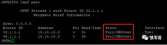 在HUB设备上查看OSPF邻居信息。状态为DROther,表示路由器既不是所连网络的指定路由器,也不是所连网络的备份指定路由器。