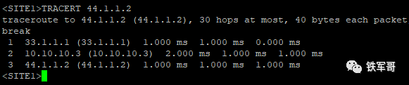 从SITE1追踪到SITE2的路径信息,可以看到,流量先到达网关SPOKE1,再到达SPOKE2,最后到达SITE2,符合Full-Mesh模型的转发路径,即:Spoke设备和Spoke设备之间建立起了S-S隧道,可以直接通信,无需绕转Hub设备。互访流量走“捷径”转发。