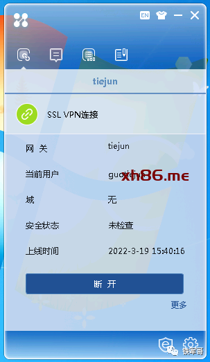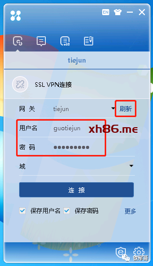 安装完成之后,先点击网关后面的刷新,查询SSL VPN的网关参数成功之后,会加载用户名和密码对话框,输入账户密码,点击连接。