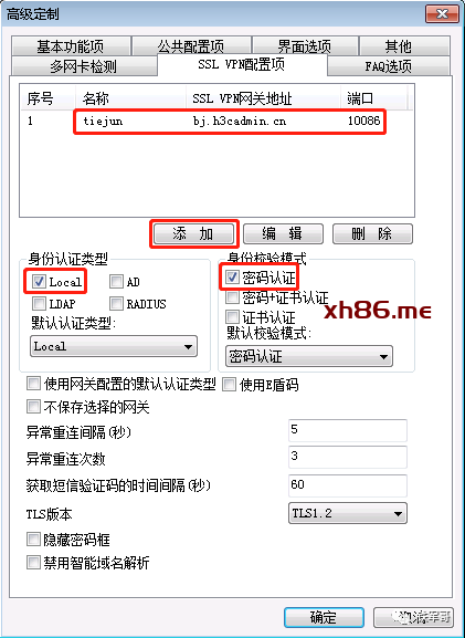 在SSL VPN配置项中,添加一个SSL VPN网关地址,设置参数与配置的相同。身份认证类型为Local,身份校验模式为密码认证。