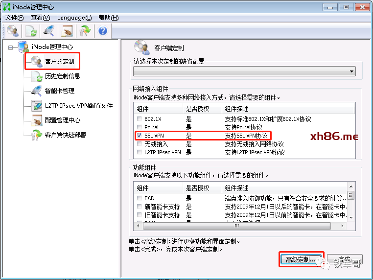安装完成之后,进入客户端定制。网络接入组件仅选择“SSL VPN”即可,然后点击“高级定制”。