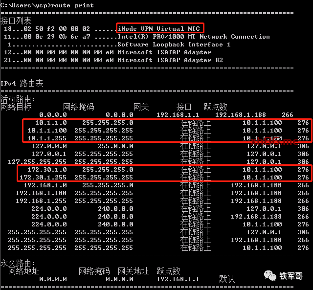 查看系统路由表,生成了新的网卡iNode VPN Virtual NIC,网卡地址为10.1.1.100,并且多了去往服务器网段的路由。